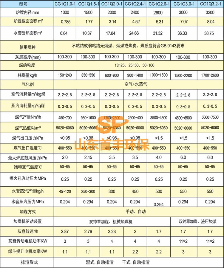 單段式煤氣發生爐技術性能參數: